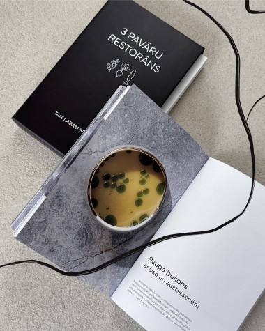 Grāmata, kas veltīta restorāna 15 gadu jubilejai, sastāv no trim daļām – Restorāns, Receptes, Rīga.